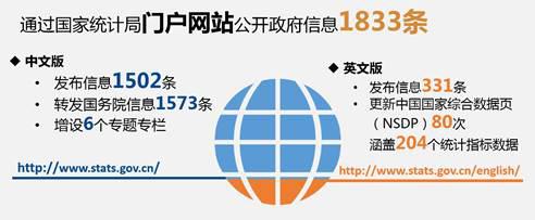 (一)着力打造门户网站主阵地作用。2018年,通过门户网站公开政府信息1833条,其中中文版信息1502条、英文版331条,内容覆盖统计数据与解读、工作动态、通知通告、机构职能、规章文件、人事工作、热点专题、其他信息等八大类信息。转发国务院信息1573条。增设“2018全国两会服务”“第九届中国统计开放日”“第四次全国经济普查”“纪念改革开放四十年”“曝光台”“2018金砖国家联合统计手册”等6个专题专栏。更新门户网站英文版中国国家综合数据页(NSDP)80次,涵盖国家统计局和财政部、人民银行、海关总署、外汇局等部门公布的204个统计指标数据。