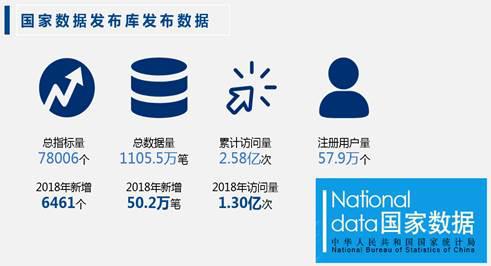 (二)着力充实统计数据服务主窗口。截至2018年底,国家数据发布库总指标量78006个,总数据量达到1105.5万笔,累计访问量2.58亿次,注册用户量57.9万。其中,2018年访问量1.30亿次,新增指标量6461个,新增数据量50.2万笔。