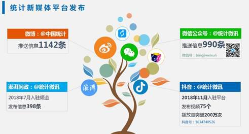 (四)着力构筑统计新媒体发布平台。2018年,微信公众号“统计微讯”推送信息990条,微博“@中国统计”推送信息1142条;以“统计发布厅”形式入驻澎湃问政频道,发布信息398条;入驻“抖音”平台,“统计微讯”抖音政务号发布视频75个,播放量突破200万次。