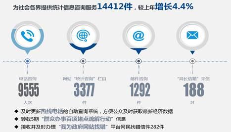 (七)着力提高统计信息咨询服务水平。2018年,为社会各界提供统计信息咨询服务14412件,较上年增长4.4%。其中,为公民、法人和其他组织提供电话咨询服务9555人次,通过门户网站“统计咨询”栏目回答公众提问3377件,接收处理邮件1292件,处理“局长信箱”来信188封。及时更新热线电话的自助查询系统,方便公众及时获取最新经济数据。转载中国政府网5期“群众办事百项堵点疏解行动”信息。接收并及时办理“我为政府网站找错”平台网民找错信件282件。