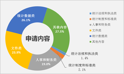2.按申请内容分,统计数据类占26.1%,文件类占23.9%,人事和财务类占19.0%,统计制度和标准类占2.1%,统计法规和执法类占1.4%,其他内容占27.5%。