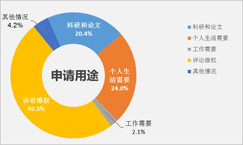 3.按申请用途分,用于诉讼维权的占49.3%,用于个人生活需要的占24.0%,用于科研和论文的占20.4%,用于工作需要的占2.1%,用于其他情况(如监督目的)的占4.2%。