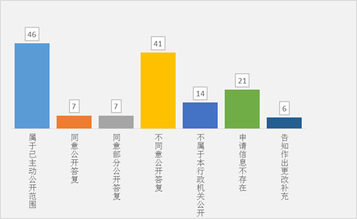 4.按答复情况分,属于已主动公开范围的46件,占32.4%;同意公开答复的7件,占4.9%;同意部分公开答复的7件,占4.9%;不同意公开答复的41件,占28.9%;不属于本行政机关公开的14件,占9.9%;申请信息不存在的21件,占14.8%;告知作出更改补充的6件,占4.2%。