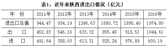近年来,在外贸增长政策持续稳定和通关环境不断优化的共同促进下,陕西进出口贸易呈现稳定快速增长态势。根据海关和商务厅数据显示,2011至2016年,全省外贸进出口总值从944.47亿元增长到1974.80亿元,增长1.1倍,年均增速15.9%,其中出口额年均增长18.2%,进口额年均增长13.6%。分阶段看,2013年、2014年属于高速增长阶段,全省外贸进出口总值增速分别为33.5%、34%,2015年、2016年外贸进出口额增速回落,2015年回落至12.8%,2016年回落至4.2%。虽然增速明显下降,但在全国范围内表现相对较好,是全国仅有的9个外贸进出口总值保持增长的省份之一。