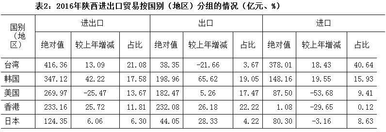 随着市场多元化战略的稳步推进,陕西进出口贸易伙伴不断增加。截至2016年,全省共与201个国家和地区建立贸易伙伴关系,较上年增加7个。台湾、韩国、美国、香港、日本等五大贸易伙伴进展稳固,2016年陕西在以上国家和地区进出口总值1390.96亿元,占全省进出口总值的70.4%。从总量看,进出口总值最高是台湾,416.36亿元,占全省进出口总值21.4%;出口额最高是香港,232.08亿元,占全省出口总值22.2%;进口额最高是台湾,378.01亿元,占全省进口总额40.6%。从速度看,整体呈现高速增长态势,增速最高是韩国,进出口总值增长42.2%,出口65.6%,进口19.6%;其次是香港,进出口总值增长25.7%,出口26.2%。部分国家和地区进出口增速有所回落,美国的进出口额较上年下降25.5%,台湾的出口较上年下降21.7%,美国、香港、日本的进口分别较上年下降53.7%、29.7%、3.2%。