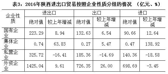 截至上世纪九十年代,国有企业一直是陕西进出口的主力军。1993年,国有企业进出口总额10.57亿美元,占全省进出口总额的84.5%。2000年以后,随着对外开放的深入,外贸经营权不断放开,外贸主体向多样化发展,各种非国有内资企业迅速崛起的同时,私营企业、外资企业已经发展成为同国有企业并驾齐驱的劲旅。2011年,国有、外资企业进出口总额占据全省总量的“七分天下”,分别为327.14亿元、362.27亿元,占全省进出口总值的34.6%、38.4%。2016年,国有、私营企业、外资企业“三足鼎立”,进出口总额分别为223.29亿元、325.72亿元、1425.04亿元,占全省进出口总额的11.3%、16.5%、72.2%,外资企业成为第一大进出口主体。从增速看,国有企业、外资企业的进出口额增长明显,分别较上年增长8.94%、9.61%;私营企业进出口额与上年相比呈下滑态势,下降16.41个百分点,其中出口下降14.69%、进口下降18.58%。