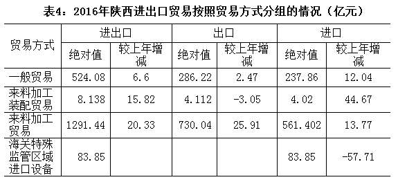 一直以来,一般贸易和加工贸易是陕西进出口的主要方式,共同形成了全省进出口贸易结构的两大支撑。2011年,全省一般贸易590.27亿元,占全省进出口总额的62.5%,加工贸易262.87亿元,占全省进出口总值的27.8%。然而,近年来加工贸易节节攀升,成为全省对外贸易的头号主力,改变了一般贸易占绝对主导地位的旧格局。2016年,一般贸易进出口总值524.08亿元,较2011年下降11.2%,占全省进出口总值的26.5%,较2011年下降36个百分点。加工贸易进出口总值1299.57亿元,较2011年增长3.9倍,占全省进出口总值的65.8%,较2011年提高38个百分点。2016年,加工贸易中来料加工装配贸易和来料加工贸易进出口增速旗鼓相当,分别较上年增长15.82%、20.33%,其中来料加工装配贸易进出口额呈现“一增一减”,进口较上年增长44.67%,出口较上年减少3.05%。此外,海关特殊监管区域进口设备的进口总额较上年大幅度下降,下降57.7%。