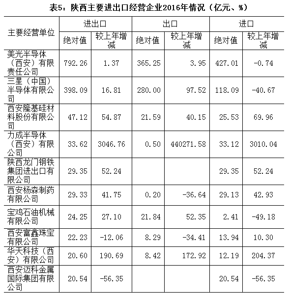 火车跑得快,全靠车头带。陕西对外贸易近年来的迅猛发展,与大型进出口企业的带动作用密不可分。全省外贸进出口前10位的企业进出口总值1417.39亿元,占全省总量的71.8%,抓住这些企业的发展,就抓住了全省外贸经济发展的“牛鼻子”。美光半导体(西安)有限责任公司和三星(中国)半导体有限公司是两个龙头,无论从总量上还是速度上,对全省对外贸易的发展形势影响巨大。2016年,两家企业的进出口总值占全省总量的60.3%,出口总值占61.8%,进口总值占58.6%,均超过全省的半数。美光出口总值增长3.95%、进口总值减少0.74%,相对平稳;三星则呈现过山车式的增减,出口总值增加138.2亿元,增长97.52%、进口总值减少80.9亿元,减少40.67%,与全省进出口增减变化在趋势上一致。西安隆基硅材料股份有限公司、力成半导体(西安)有限公司的外贸发展取得骄人成绩,进口出口双连增,对全省对外贸易的贡献突出。