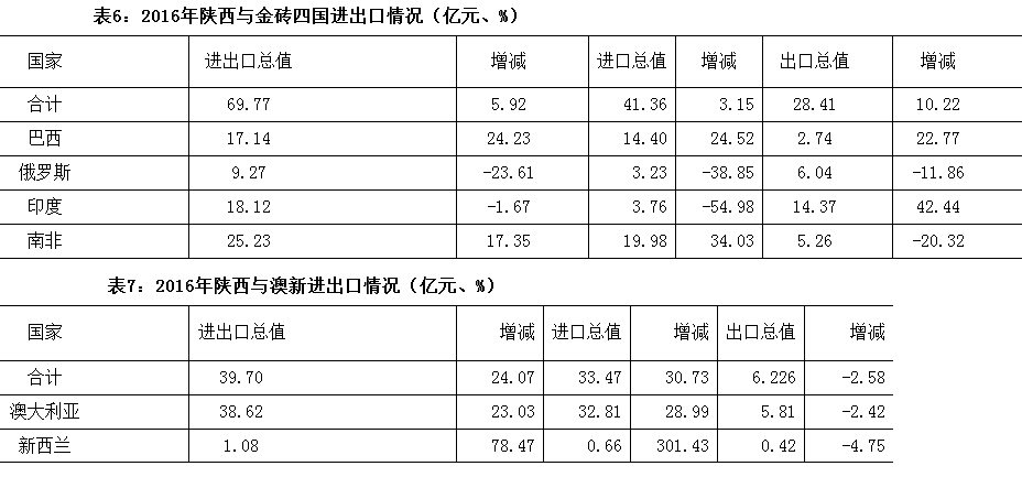 从全国外贸发展形势看,国际市场需求的低迷已经对外贸进出口产生了直接影响。例如,之前受欧债危机影响,陕西对欧洲出口额严重萎缩。寻找新的外贸市场,能够为确保外贸持续发展增添新活力、新血液。2016年,陕西在金砖国家进出口额整体呈现小幅提升,五国进出口总值69.77亿元,较上年增长5.92%,进口增长3.15%、出口增长10.22%。进出口总值占比较高的南非、巴西均保持两位数增速,分别为17.35%、24.23%。澳新两国进出口同样保持两位数增速,澳大利亚进出口总值38.62亿元,较上年增加7.2亿元,增长23.03%。