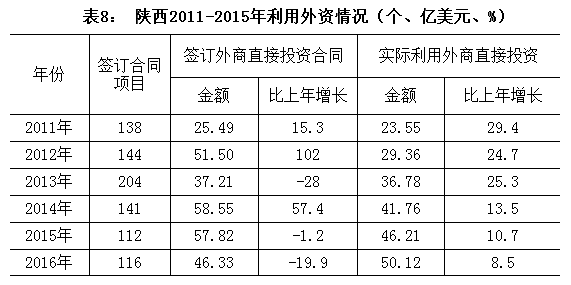 陕西把握了国际产业和国际资本加速向中国转移,西部大开发和“一带一路”倡议的历史机遇,不断完善外商投资环境,利用外资实现跨越式发展。从1983年获批成立首家外商投资企业金花饭店之始,陕西利用外资量实现了逐年攀升的良好局面。2016年,合同利用外资46.33亿美元,较2011年增长1.8倍,年均增速12.7%;实际利用外资50.12亿美元,较2011年增长2.1倍,年均增长16.3%。利用外资项目规模、质量全面提升,2016年陕西签订外商合同项目116个,虽然数量较2011年略有下降,但是单个项目实际利用外资均值达4321万美元,是2011年的2.5倍。利用外商投资效率提高,实现了外资到位率的“大逆转”。2016年,外资到位率持续增高,实际利用外资额首次超过合同利用外资额,超出8.2%,与近五年外资到位率最低的2012年相比,实际利用外资额占合同利用外资额比重高出2012年51.1个百分点。