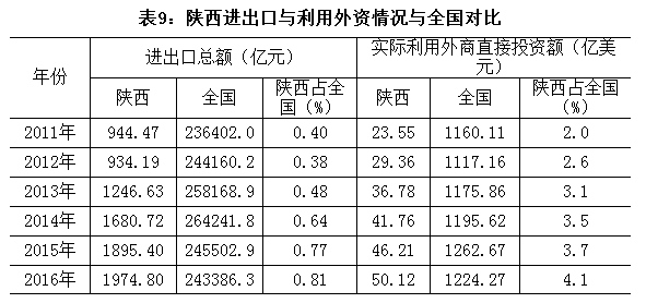 近年来,陕西充分结合省情,发挥区位优势,积极深化对外开放,坚持“引进来”与“走出去”相结合,出台一系列促进贸易和投资增长的措施,对外贸易规模和质量实现“双提升”,利用外资实现跨越式发展。陕西地处西北内陆,对外贸易起步较晚,进出口贸易和利用外资经历了从无到有,从小到大的发展历程。近年来,陕西全面贯彻落实国家支持外贸发展的各项政策措施,打造全方位对外开放格局,对外贸易取得跨越式发展。近五年,陕西进出口总额在全国的位次实现“六连升”,2016年进出口总额增速居全国“榜眼”,实际利用外商直接投资增速高出全国均值4.6个百分点。