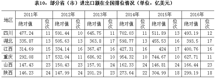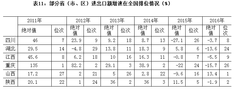 从外贸进出口增速看,陕西在6省(市)中最为突出,从2011年的全国增速第22位,提升至2016年第2位,提升20个位次。其余5省(市),进出口增速提高最快的是山西,从2011年的第27位,上升至2016年的第1位,提升了26个位次,上升幅度居全国第1。四川、湖北、江西、重庆五年来增速没有明显提升,尤其是近两年随着全国进出口贸易整体趋势的下降,增速明显下滑。