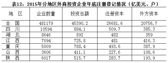 2015年,全国拥有外商投资企业48.1万户,投资总额4.5万亿美元,注册资本2.7万亿美元,外方注册资本占比77.8%。从投资总量看,陕西外商投资企业数量偏少、投资额较低,不足全国平均水平。陕西外商投资企业6017户,数量居6省(市)中第4位,全国占比仅为1.3%;外商投资总额515.7亿美元,排第5位,全国占比1.1%;外商投资注册资本总额283.7亿美元,排第5位,全国占比1.1%;外方投资注册资本193.9亿美元,排第5位,全国占比0.9%。从投资规模看,陕西外商投资企业户均投资额857.1万美元,较全国平均水平低9.1个百分点。6省(市)中户均投资额最高的是重庆,达1574万美元,高出陕西83.7%;湖北、江西、陕西户均投资额在1000万美元以上。