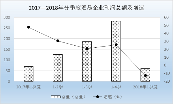 2018年一季度,全省限额以上贸易企业整体盈利能力减弱,全省限额以上贸易企业实现利润总额59.5亿元,下降12.8%,同比回落60.4个百分点,较2017年回落38.6个百分点。