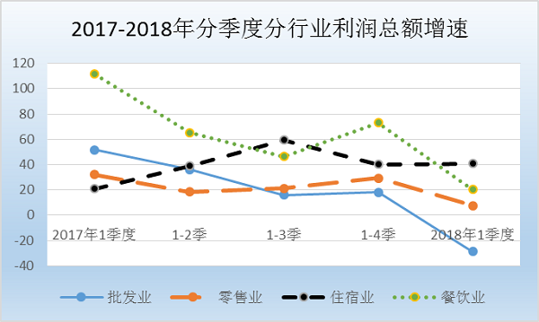 分行业来看,除住宿业外,其他三个行业限上企业利润总额增速均同比回落。2018年一季度,批发业实现利润总额29.5亿元,下降28.7%,同比回落80.3个百分点;零售业实现利润总额31.3亿元,增长7.6%,同比回落24.4个百分点;