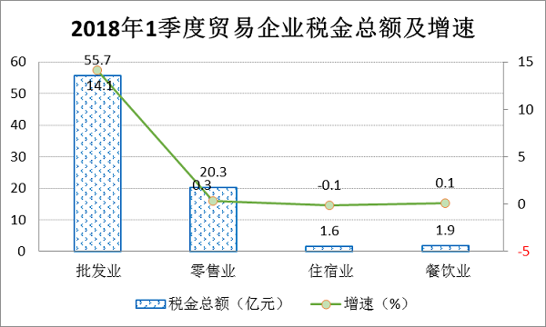 一季度,全省限额以上贸易企业税金总额增长14.3%,同比提高28.8个百分点,分行业来看,批发业税金总额增长14.1%,同比提高29.5个百分点,是拉动全省限额以上贸易企业税金总额增长的主要力量;其他三个行业税金总额增速平稳,零售、住宿和餐饮业税金总额分别增长0.3%、-0.1%和0.1%。