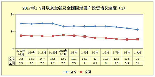 今年以来,全省坚持稳中求进的工作总基调,着力扩大有效投资,补齐发展短板,固定资产投资持续保持较快增长。2018年前三季度,全省固定资产投资同比增长11%,较上半年回落1.9个百分点,增速高于全国5.6个百分点,位居全国第六位,稳居全国第一方阵。