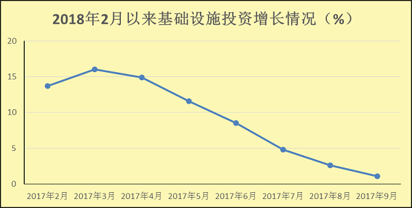 前三季度,基础设施投资同比增长1.1%,自今年3月以来增速连续六个月回落,较上半年回落7.4个百分点,比上年同期回落29.4个百分点,降至2013年以来最低水平。其中占比最高的水利、环境和公共设施管理业投资同比增长2.2%,较上半年回落5.7个百分点;电力、热力的生产和供应业投资同比下降16.4%,降幅较上半年扩大12.3个百分点,交通运输邮政业投资同比增长14.4%,较上半年回落7个百分点,信息传输业投资同比下降27.7%,较上半年回落29个百分点。