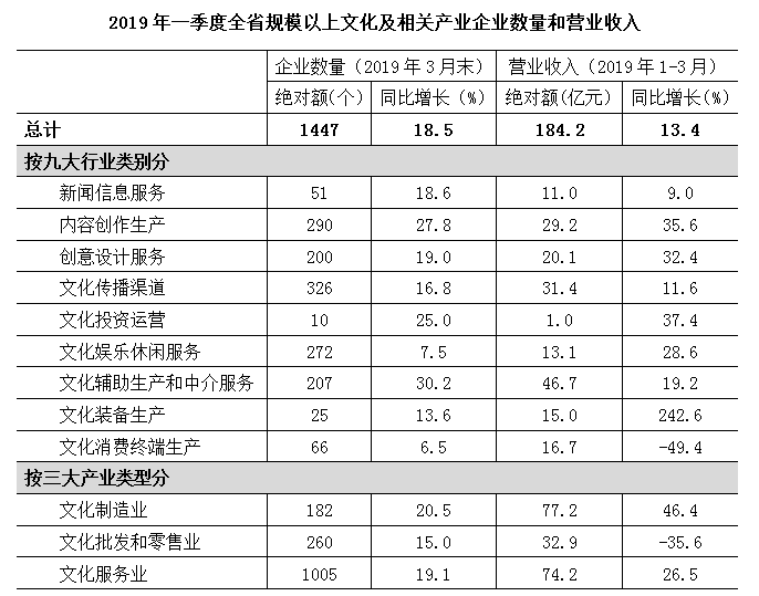 今年以来,省委省政府以习近平新时代中国特色社会主义思想为指导,坚持稳中求进工作总基调,坚持新发展理念,不断深化文化体制改革,进一步完善文化管理体制,积极培育新型文化业态,推动我省文化产业实现开门红。一季度,全省文化产业开局喜人,规模以上文化企业数量达到1447个,比上年同期增加226个,实现营业收入184.2亿元,同比增长13.4%,增速比上年同期快7.8个百分点,比全国平均水平快5.1个百分点。具体来看,一季度我省文化产业发展呈现出以下五个显明特点: