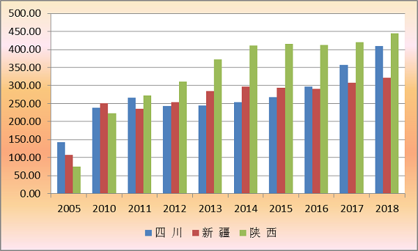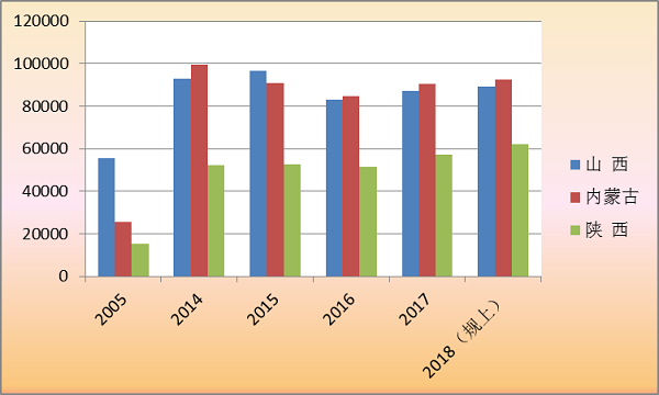 近年来,我省煤炭产量快速增长,占全国煤炭产量比重不断提高,持续发挥着带动全省经济快速发展的重要作用。从总量来看,我省利用优质煤炭资源和地理区位优势,原煤产量不断增加。2018年我省原煤产量62958.08万吨,居全国第三位,是2005年的4.1倍,年均增长11.5%,高于全国煤炭产量平均增速7.7个百分点,占全国煤炭产量比重逐年提高。2018年全省煤炭产量占全国煤炭的比重达17.6%,比2005年占比提高10.7个百分点,产量年均增速也高于山西和内蒙,逐渐缩小了与两者之间的差距,能源战略地位不断提高(见图1)。