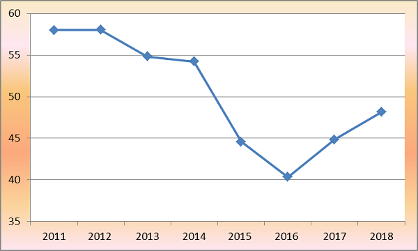 能源产业对全省工业发展起着决定性的作用。2015年以前,我省能源产业增加值占规上工业增加值的比重在50%以上,随着经济转型,结构优化调整,能源产业增加值占比下降(见图6)。2018年,陕西能源工业增加值占规上工业的比重为48%,较2011年降低10个百分点,但仍然占据近半壁江山,另一方面也说明我省经济结构日趋向好。